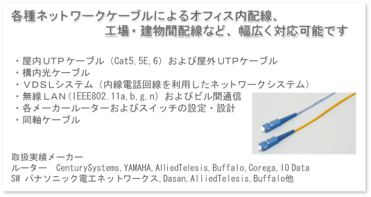 なお、拠点間のVPN接続や、インターネット会議システム、ネットワークカメラ、無線LAN設計なども実績がございますので、