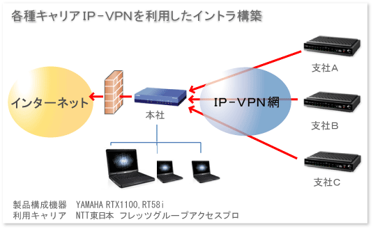 本-支店間をIP-VPNを利用して接続。本社に設置している共有資源(ファイルサーバ プリンタ、 アプリケーションサーバ、WEBサーバ)を支社から利用できるように構築。